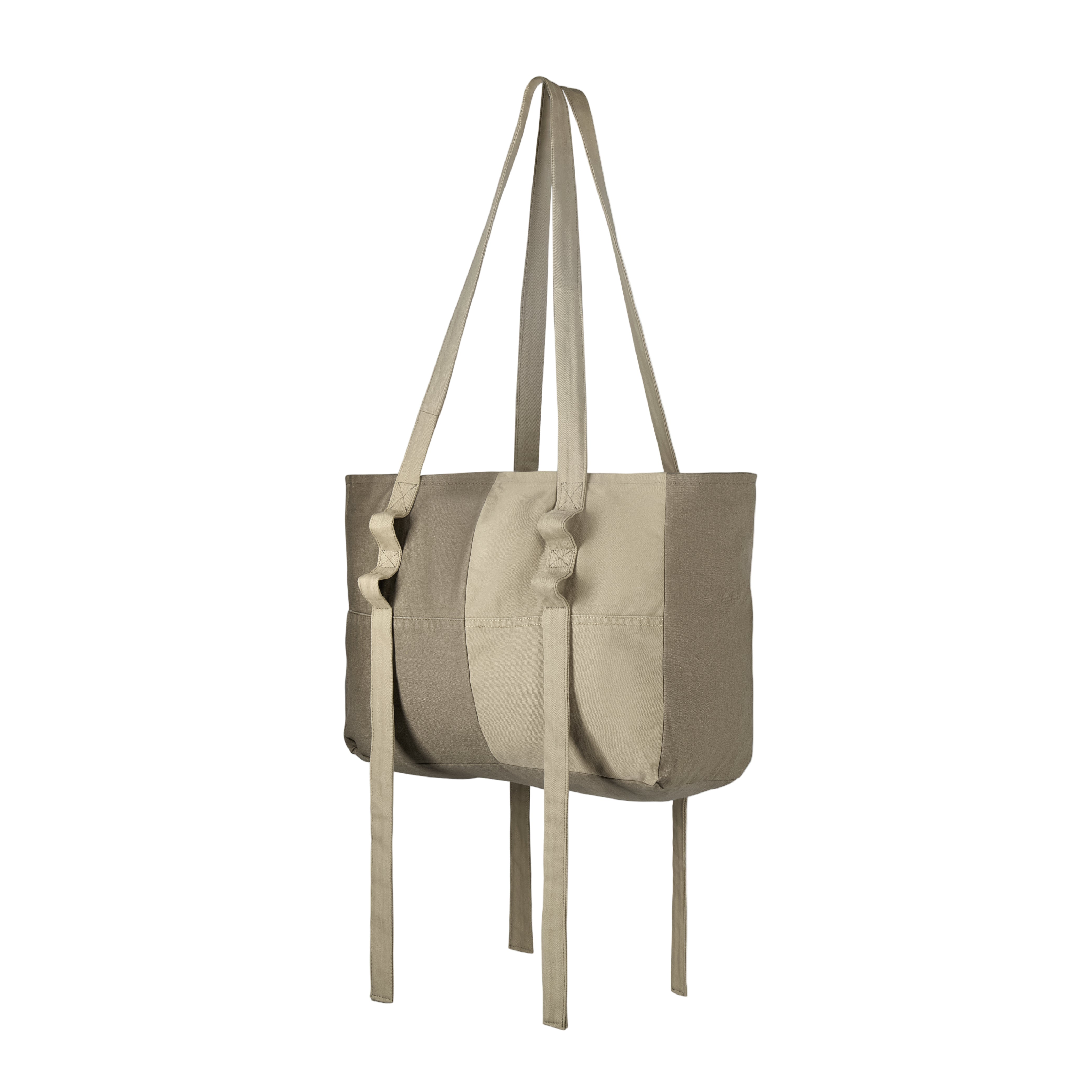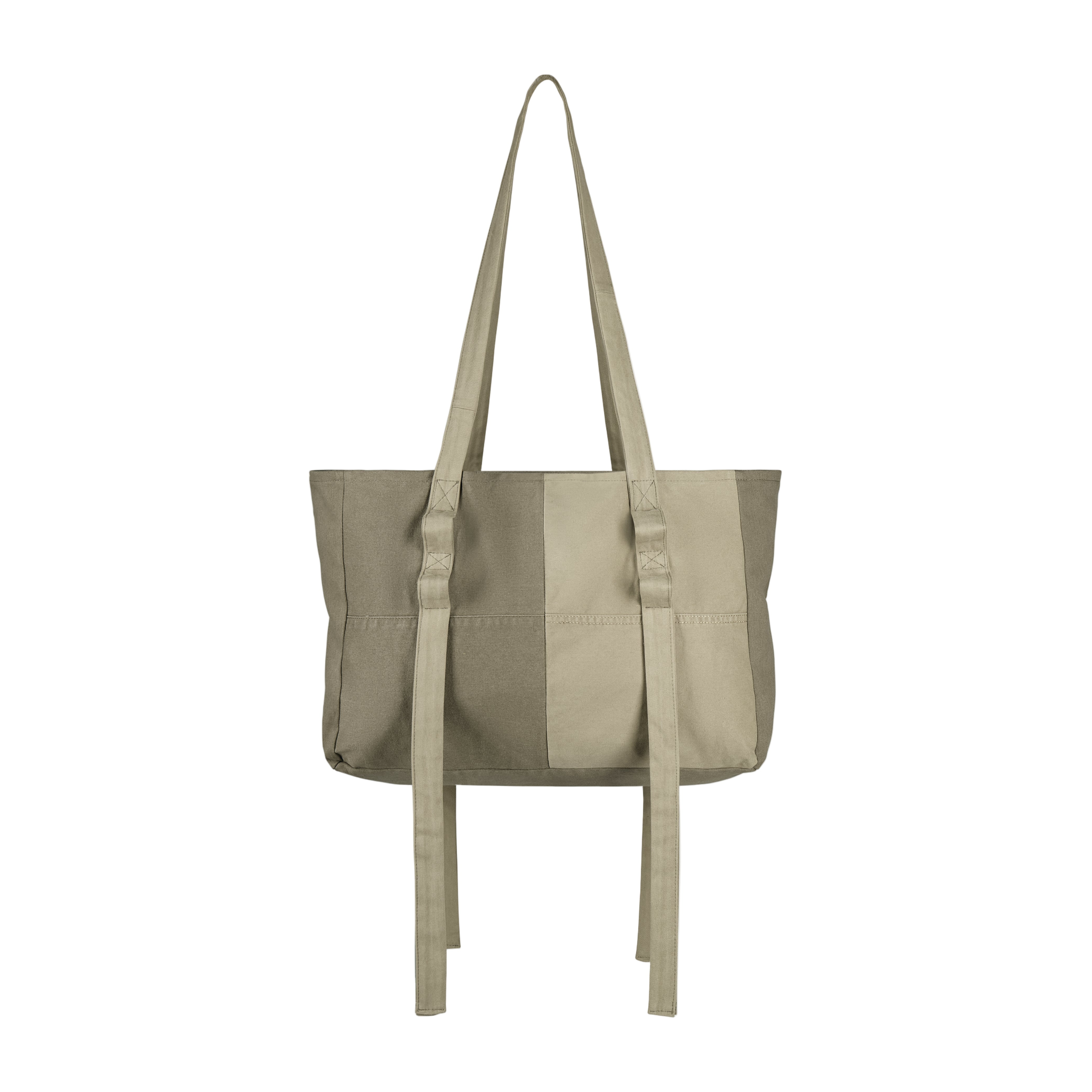 Crafted from two upcycled pairs of trousers, the Good Goods bag features a spacious main compartment constructed from multiple panels, with an internal pocket repurposed from the original trouser back.